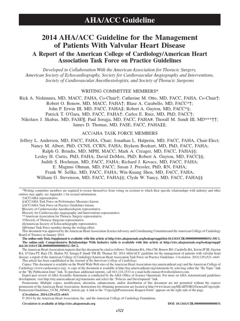 The American Heart Association requests that this document be cited as follows: Nishimura RA, Otto CM, Bonow RO, Carabello BA, Erwin JP III, Guyton RA, O'Gara PT, Ruiz CE, Skubas NJ, Sorajja P, Sundt TM III, Thomas JD. 2014 AHA/ACC guideline for the management of patients with valvular heart disease: executive summary: a report of the American.