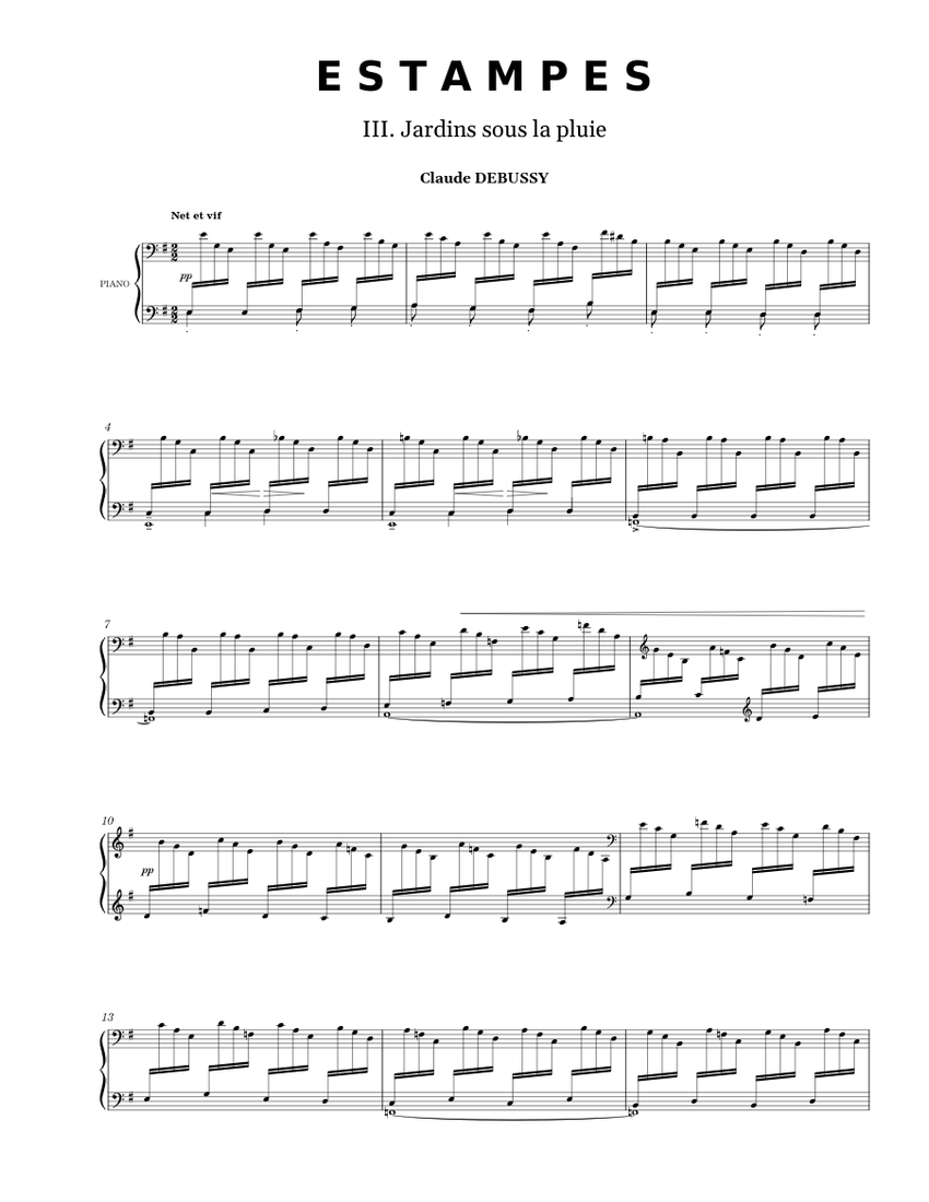 Jardins sous la pluie - Claude Debussy - Estampes III. Sheet music for Piano (Solo) | Musescore.com. Off. 100%. F, d. Download and print in PDF or MIDI free sheet music of Estampes - Claude Debussy for Estampes by Claude Debussy arranged by Vinckenbosch for Piano (Solo)
