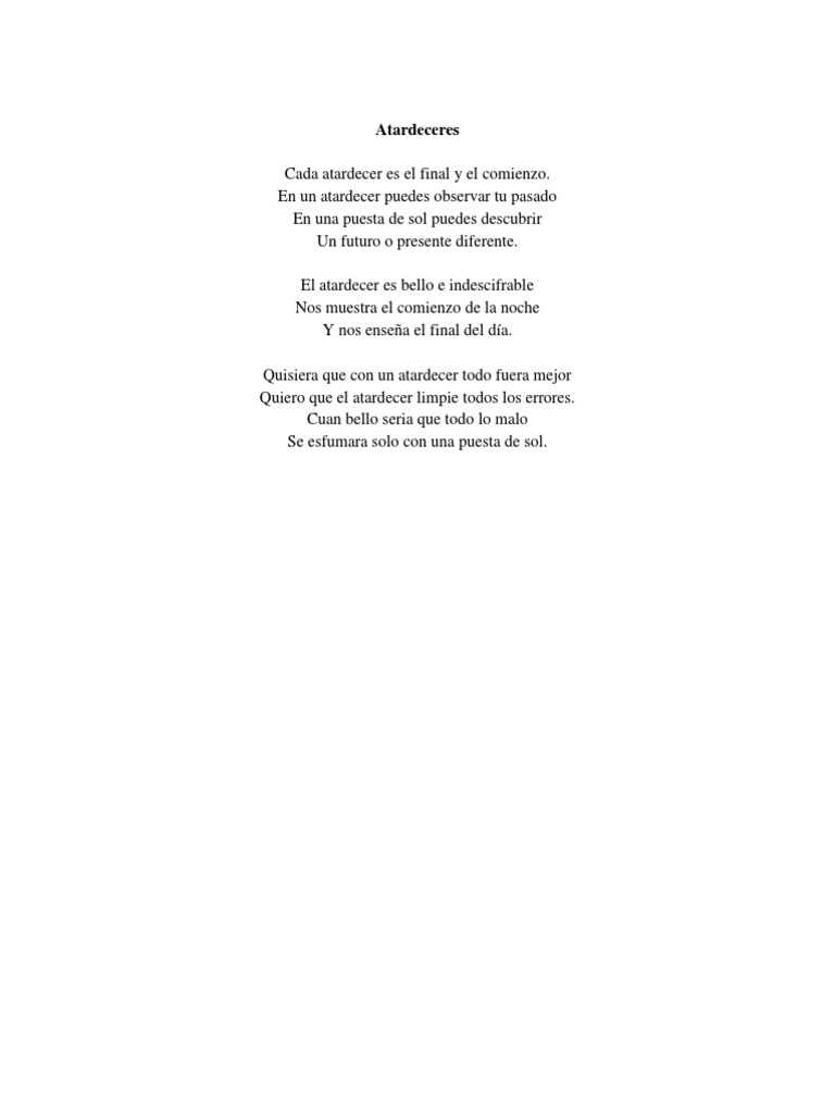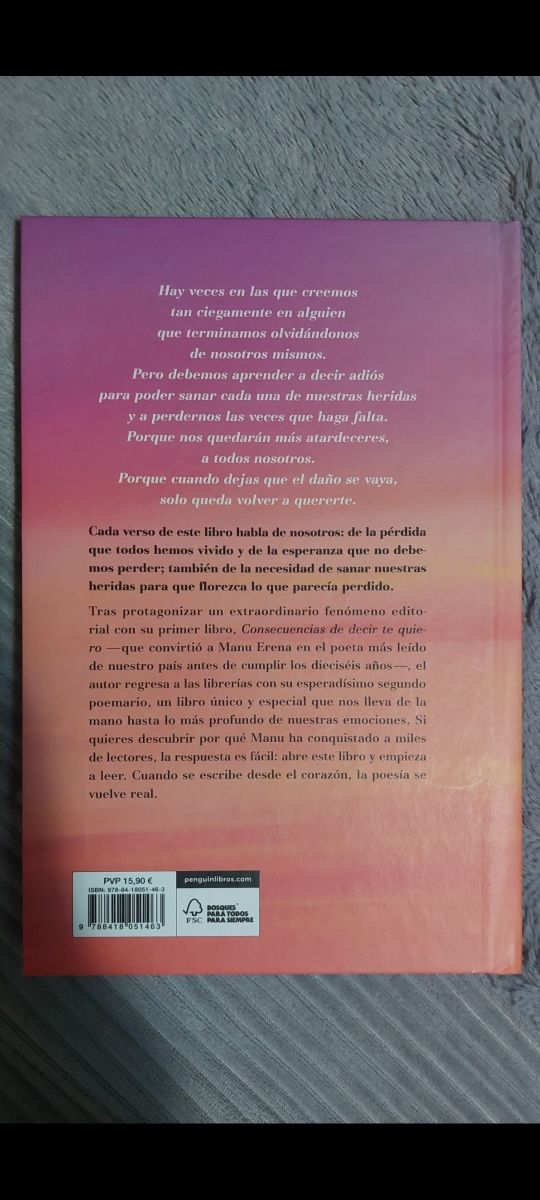 Porque nos quedarán más atardeceres, a todos nosotros. Porque cuando dejas que el daño se vaya, solo queda volver a quererte.». Cada verso de este libro habla de ti. Habla de la pérdida que todos hemos vivido y de la esperanza que nunca debemos perder. Habla de cómo siempre debemos sanar nuestras propias heridas para que florezca lo que.