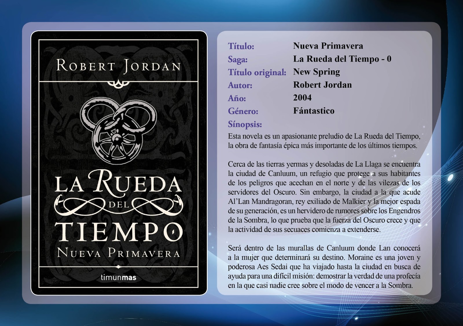 La rueda del tiempo; Nueva primavera. El ojo del mundo Nueva primavera (en. pero quedó decepcionado con la recepción de Nueva primavera y decidió posponer esto hasta que se completara la serie principal. [1] Sin embargo, su muerte el 16 de septiembre de 2007, antes de la finalización de la novela final de la serie, hace que la.