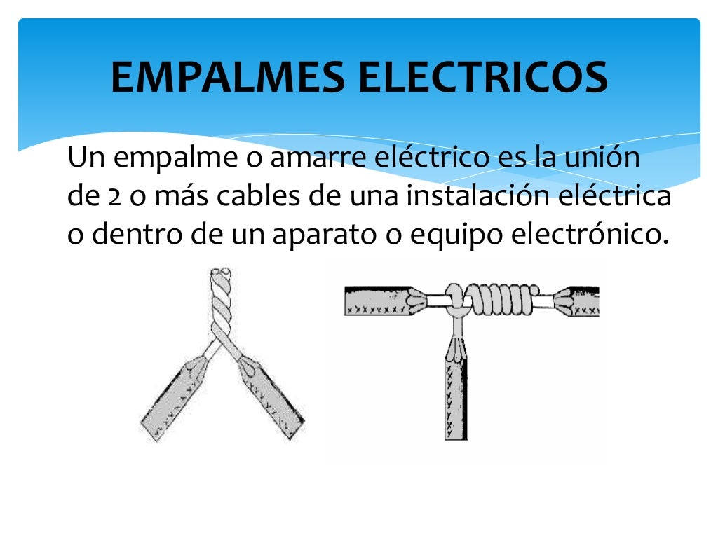 Empalmes eléctricos, ¿qué son? Los empalmes eléctricos son la unión entre dos o más cables de una instalación eléctrica que pueden tener diferentes objetivos como prolongar un cable, reparar un cable cortado o derivar uno o dos cables de una línea principal, entre otros. Existen diferentes tipos de empalmes según el objetivo.